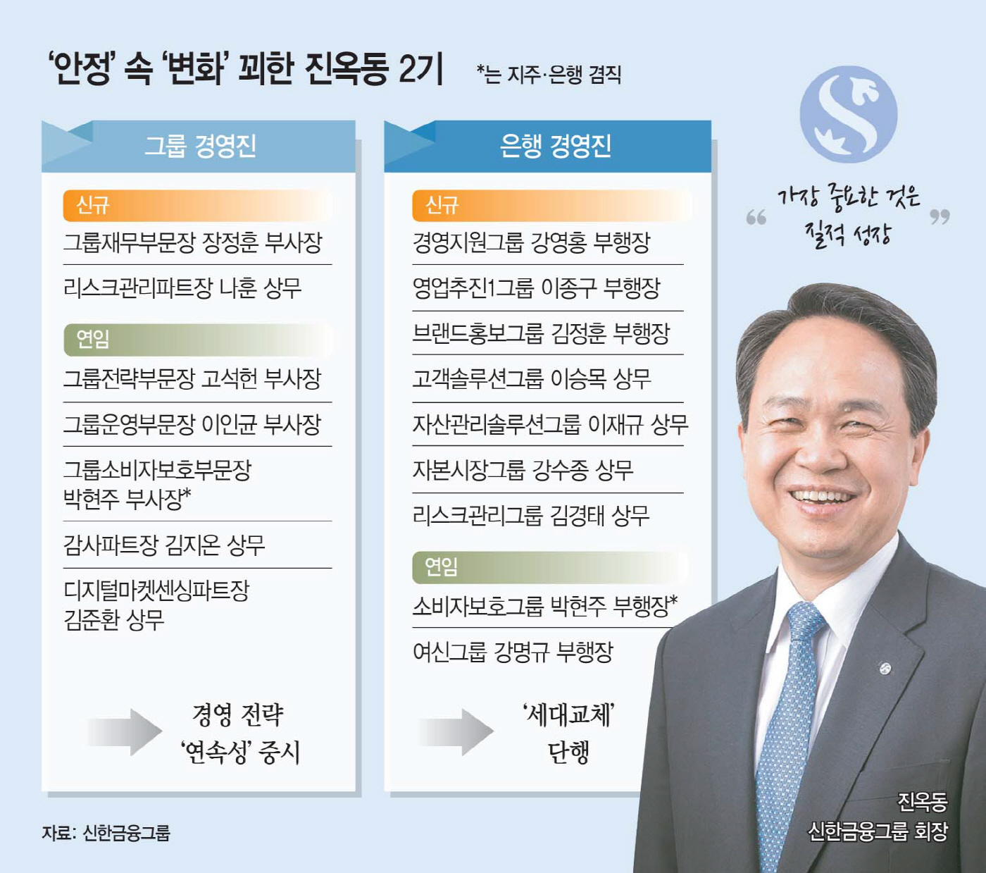 물론 변화도 존재한다. 주력 자회사인 신한은행은 영업추진1그룹, 고객솔루션그룹, 자산관리솔루션그룹, 자본시장그룹, 리스크관리그룹, 경영지원그룹, 브랜드홍보그룹 등 7곳의 경영진을 신규 선임했다. 각 부문별 전문성과 역량을 갖춘 적임자를 통해 '고객중심 영업체계 구축'과 '미래 경쟁력 강화'를 동시에 추구한다는 구상이다.