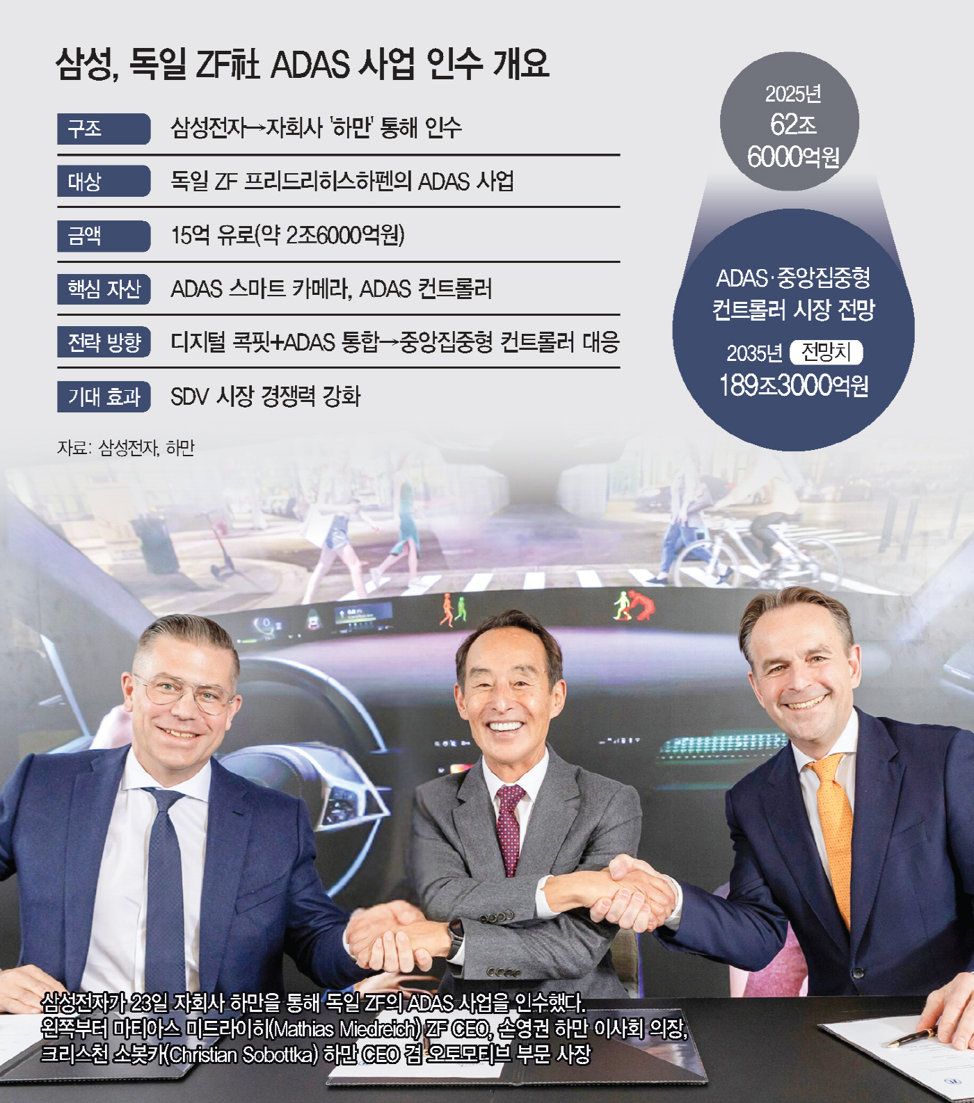 하만은 ZF의 ADAS 사업 인수를 통해 차량용 전방카메라와 ADAS 컨트롤러 등 자동차 주행 보조의 핵심인 ADAS 기술과 제품을 확보할 계획이다. 최근 자동차는 IT 기술과 소프트웨어를 결합한 SDV(소프트웨어 정의 자동차)로 발전하며, 디지털 콕핏과 ADAS가 통합되는 중앙집중형 컨트롤러 구조로 전환되고 있다. 삼성전자는 하만의 주력 제품인 디지털 콕핏에 ADAS를 중앙집중형 컨트롤러 구조로 통합, 빠르게 전환되는 자동차 트랜드를 선도할 수 있는 역량을 확보할 것으로 내다봤다. 삼성전자에 따르면 ADAS와 중앙집중형 컨트롤러 시장은 올해 62조6000억원 규모에서 연평균 12%씩 성장, 10년 뒤인 2035년에는 189조3000억원으로 커질 전망이다.
