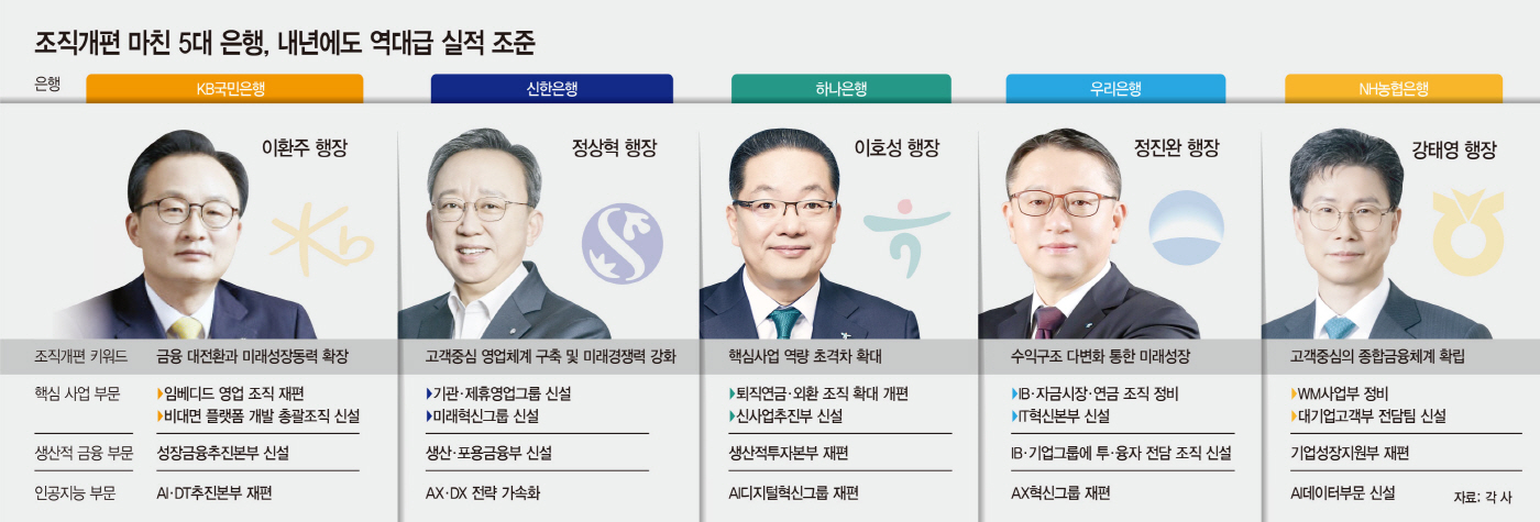KB국민·신한·하나·우리·NH농협 등 5대 시중은행의 연말 조직개편이 마무리되면서, 각 은행은 핵심 사업 조직을 재정비하며 경쟁력 강화에 나섰다. 금융당국이 내년에도 강도 높은 가계대출 관리 기조를 이어갈 것으로 예상돼 이자이익 둔화가 불가피한 만큼, 기존 수익 동력을 강화하는 동시에 새 수익원을 확보하려는 움직임이 분주하다.
