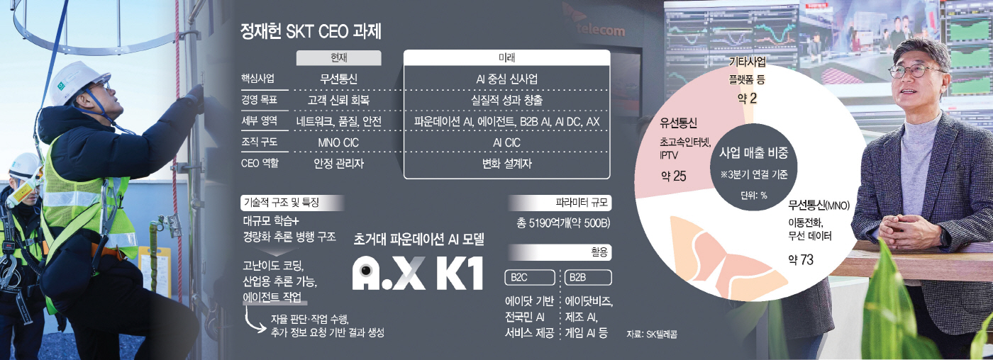 최근 조직 구조도 이 두 과제를 기준으로 재편됐다. SK텔레콤은 최근 MNO와 AI를 양축으로 하는 양대 CIC(사내회사) 체제를 공식화했다. MNO CIC는 고객 신뢰 회복과 본원적 경쟁력 강화에 집중하고, AI CIC는 에이닷을 비롯한 B2C·B2B AI와 데이터센터, 파운데이션 모델을 중심으로 성과 창출을 책임진다. 안정이 필요한 영역과 빠른 전환이 요구되는 영역을 분리해 관리하겠다는 판단이다.