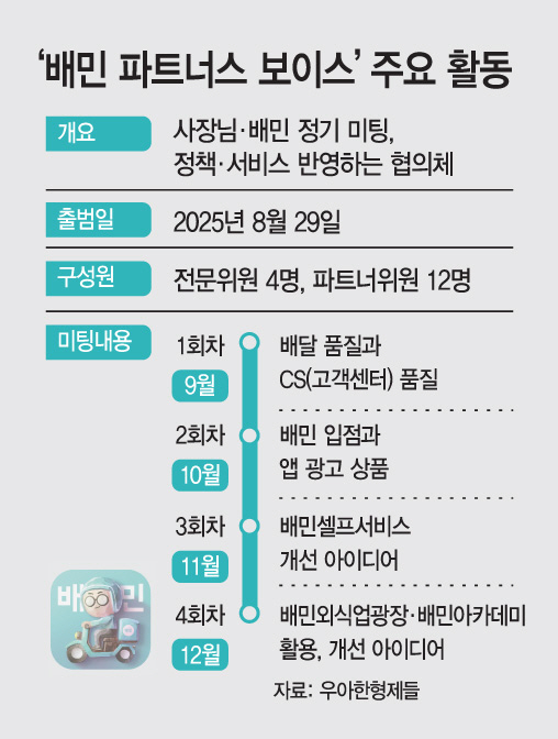 28일 우아한형제들에 따르면 배민 파트너스 보이스는 지난 9월부터 이달까지 매달 총 4회차 정기 미팅을 진행했으며 내년 2월 해단을 앞두고 있다. 해단식에서는 그동안 파트너 위원들이 제안·조언한 내용을 배민이 얼마나 반영하고 개선했는지 살펴볼 예정이다.