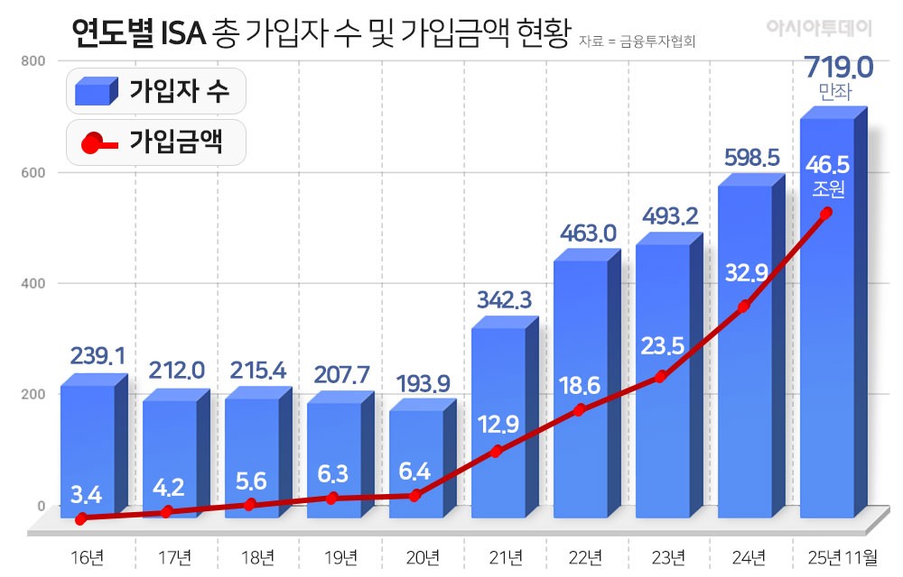 29일 금융투자협회에 따르면 지난 11월 말 기준 ISA 가입자 수가 719만명, 가입금액은 46조5000억원으로 집계됐다. 가입자 수가 700만 명을 돌파한 것은 지난 2월 말 600만 명을 기록한 이후 불과 9개월 만으로, 올해 들어 매달 약 11만 명씩 신규 가입자가 늘어난 셈이다.