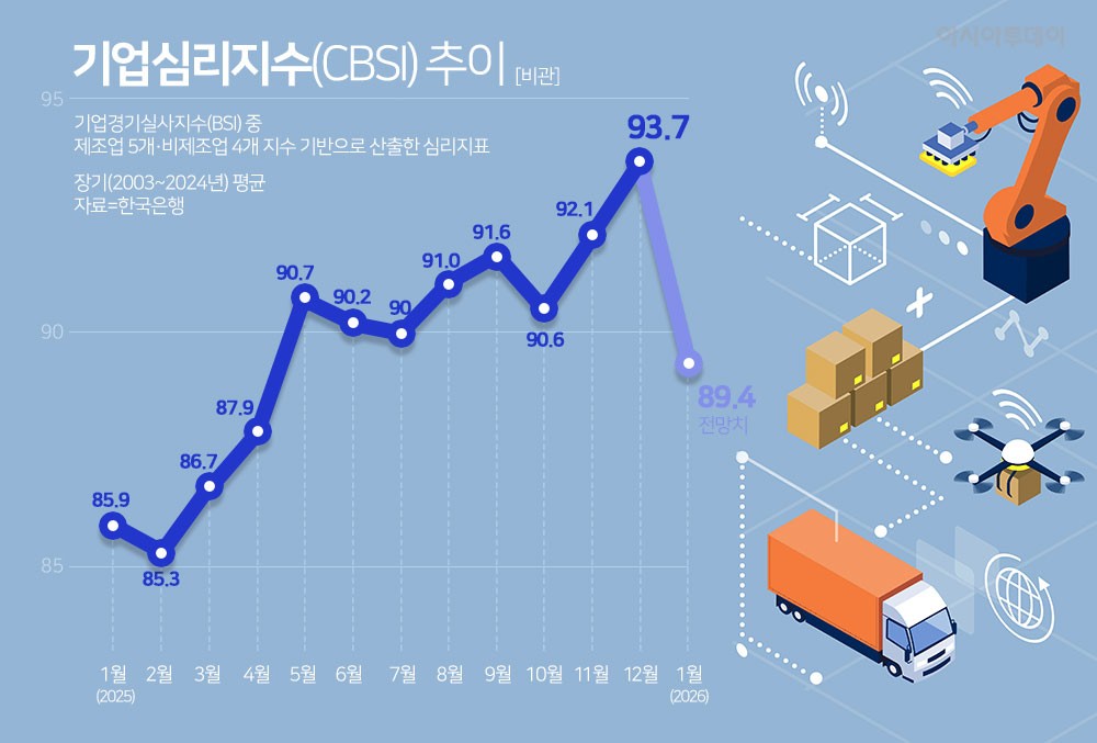 CBSI는 기업경기실사지수 중 주요지수(제조업 5개 및 비제조업 4개)를 바탕으로 산출하는 심리 지표다. 과거 장기 평균(2003년 1월~2024년 12월)을 100으로 설정하고, 이를 웃돌면 경제 전반에 대한 기업 심리가 낙관적임을 뜻한다. 반대로 100을 밑돌면 비관적이란 의미다.
