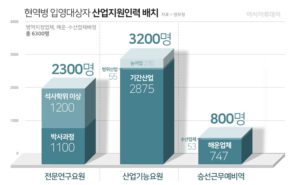 30일 병무청에 따르면 현역병 입영대상자 가운데 전문연구요원 2300명, 산업기능요원 3200명, 승선근무예비역 800명이 각각 산업지원인력으로 배치된다. 이번 산업지원인력 확대 배정과 무관하게 사회복무요원 소집대상자(보충역)는 병역지정업체에 채용·편입(승선 제외)된다.