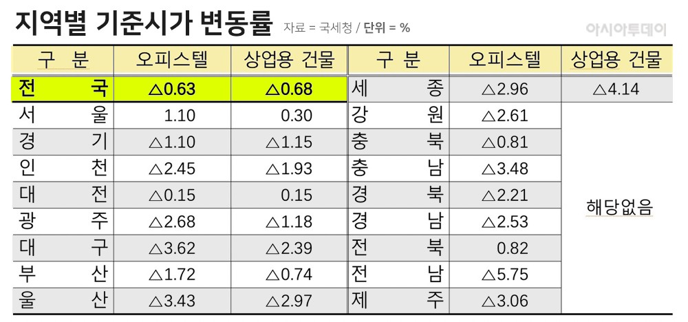 서울은 오피스텔(1.10%)과 상업용 건물(0.30%) 모두 기준시가가 오른다.