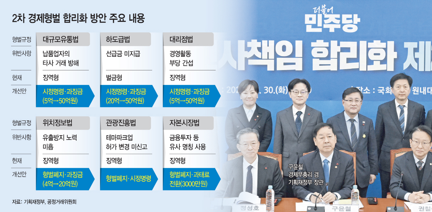 당정은 30일 오전 국회에서 당정협의회를 열고 331개 경제형벌 규정 정비를 골자로 하는 '2차 경제형벌 합리화 방안'을 발표했다. 이번 대책은 지난 9월 발표된 1차 방안(110개 규정 정비)에 이어 두 번째다.