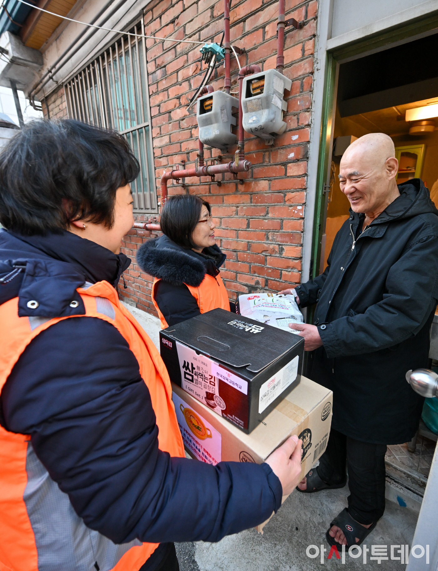 31일 서울 노원구 공릉동 한 독거 어르신 가구를 방문한 장영미 공릉2동 주민센터 동장(가운데)과 김윤희 복지1팀장이 박태준 어르신에게 쌀10kg과 라면 한 박스 등 생필품을 전달하고 있다. 노원구는 2026년 희망온돌 따뜻한 겨울나기 사업을 통해 16일 기준 8억원 상당의 현금과 현물을 모금했다. 모금은 26년 2월 14일까지 진행되며, 기부물품은 생계·의료·주거·교육·긴급구호 등 도움이 시급한 이웃과 사회복지시설을 위해 사용될 예정이다. /정재훈 기자