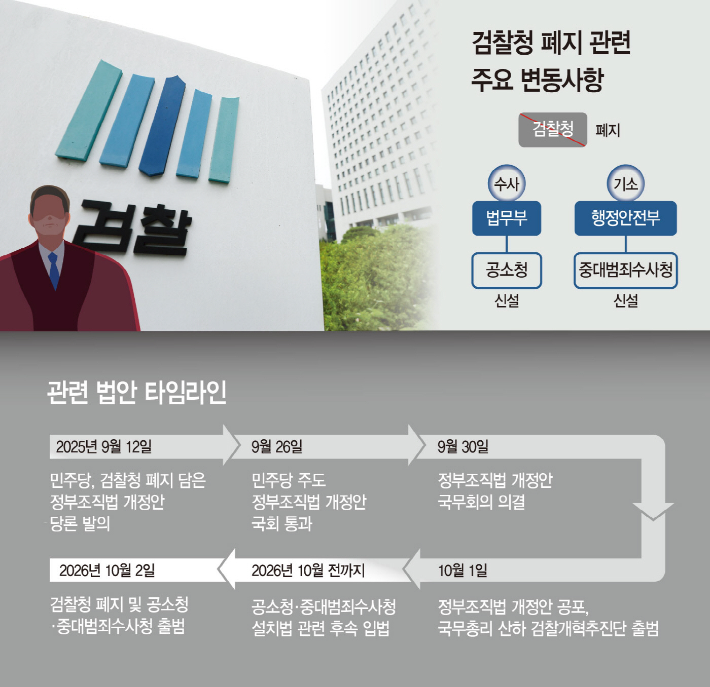 우리나라 형사사법 체계의 한 축을 지지하던 검찰이 오는 10월 2일 역사 속으로 사라진다. 1948년 정부 수립과 함께 출범한 검찰은 여권의 '검찰개혁'이라는 이름 아래 결국 폐지 수순을 밟게 됐다.