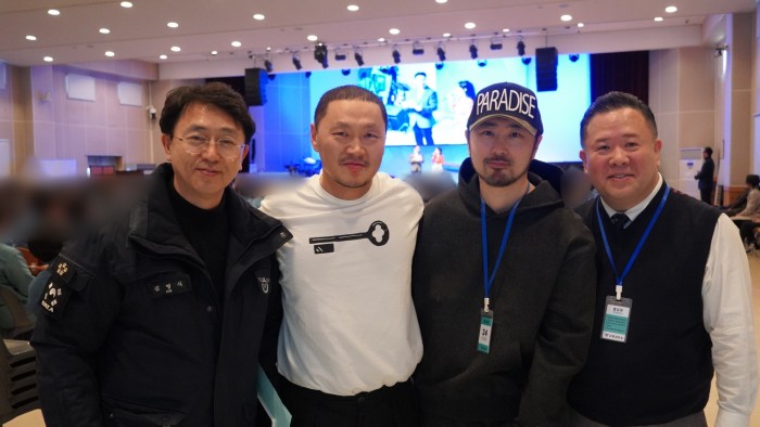 | 지난 1일 경기 여주시 소망교도소 아가페랜드 예배당에서 열린 ‘2026 소망공동체 신년 음악회 & 감사예배’는 극동방송 ‘좋은아침’ MC 송옥석 광주방송지사장과 가야금 명인 이예랑 교수의 사회로 진행됐다. 왼쪽부터 김영식 소망교도소 소장, 양동근 가수 겸 배우, 채여준 감독, 곽성훈 대표. |