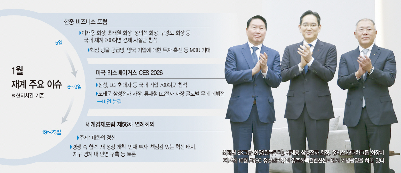 이재명 대통령의 중국 국빈 방문은 4~7일 이뤄지며, 재계 인사들로 구성된 경제사절단의 주요 일정인 한중 비즈니스 포럼은 5일 열린다. 이 자리에는 이 회장, 최 회장, 정의선 현대차그룹 회장, 구 회장 등 4대 그룹 총수를 비롯해 허태수 GS그룹 회장, 장인화 포스코그룹 회장, 구자은 LS그룹 회장 등이 포함된 것으로 알려졌다.