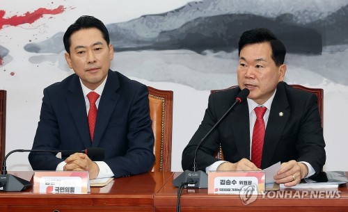 5일 국회에서 열린 국민의힘 야당탄압가짜뉴스감시특별위원회 임명장 수여식 및 제1차 전체 회의에서 김승수 위원장(오른쪽)이 인사말을 하고 있다. /연합뉴스