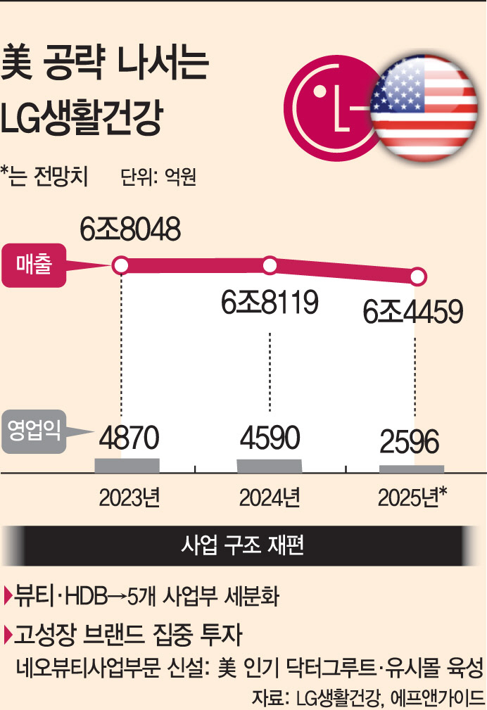 최근 3년간 LG생활건강(이하 LG생건)은 뚜렷한 성장 동력을 확보하지 못한 채 실적 부진을 겪어 왔다. 금융정보업체 에프앤가이드에 따르면 지난해 LG생건의 매출과 영업이익도 6조4459억원, 2596억원으로 각각 전년 같은 기간 대비 5.4%, 43.5% 하락할 것으로 추정했다. 기존 중국 중심 성장 공식이 흔들리며 새로운 돌파구가 필요해진 상황이다.