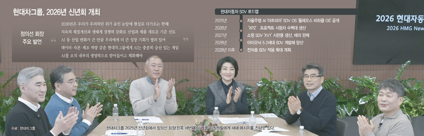 정의선 회장은 5일 열린 2026년 신년회를 통해 이같이 말했다. 신년회는 정 회장을 비롯해 장재훈 부회장, 호세 무뇨스 현대차 사장, 송호성 기아 사장, 이규석 현대모비스 사장 등이 참석했다. 사전 녹화된 영상을 통해 전 세계 임직원들에게 공유됐다.