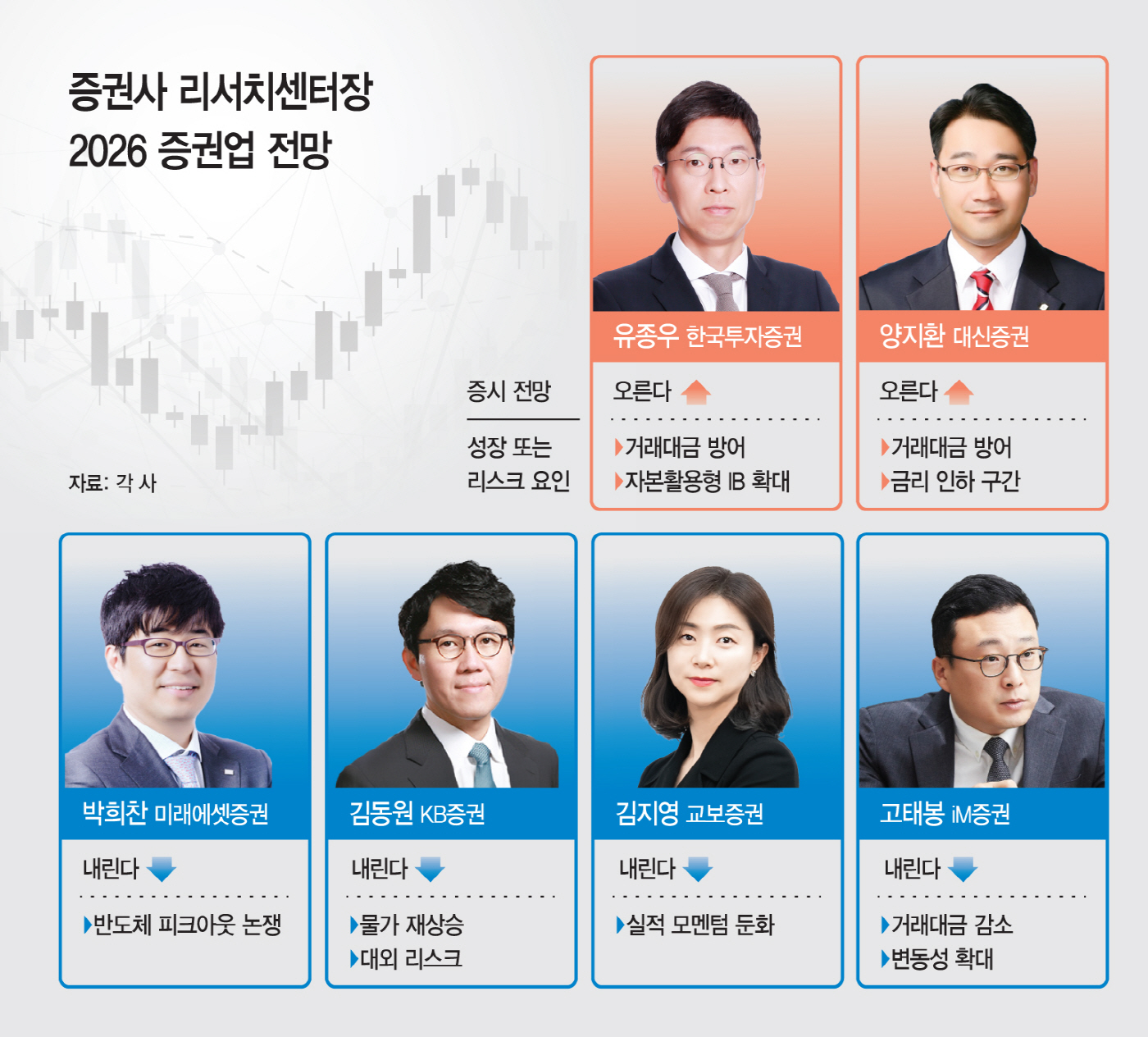 그러나 하반기부터는 리스크 관리가 필요하다는 의견이 우세하다. 박희찬 미래에셋증권 리서치센터장은 상반기 강세 가능성에는 무게를 두면서도 "기업이익 증가 기대가 큰 만큼 주가 레인지가 높게 형성될 수 있으나 하반기로 갈수록 2027년 반도체 피크아웃 이슈 등이 제기되며 변동성 리스크가 커질 수 있다"고 전망했다.