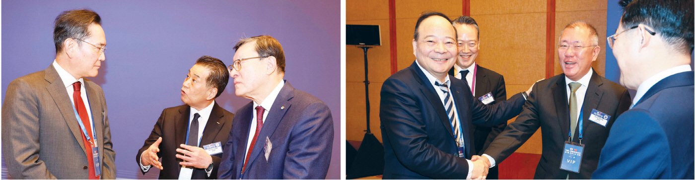최 회장은 "다른 것을 존중하되 공통의 목표를 모색하자는 '구동존'이라는 표현처럼, 오늘 이 자리가 두 나라 대표 경제인들이 서로 차이를 넘어 좋은 성장의 실마리를 함께 찾아가는 계기가 되길 바란다"고 강조했다. 정의선 현대차그룹 회장은 이날 취재진에 "중국에서 판매량과 생산량이 많이 떨어졌지만 겸손한 자세로 중국 내에서 생산과 판매를 늘려갈 계획"이라며 "이번 한중 정상회담으로 양국의 관계가 개선되면 현대차에도 크게 도움이 될 것으로 기대한다"고 말했다.