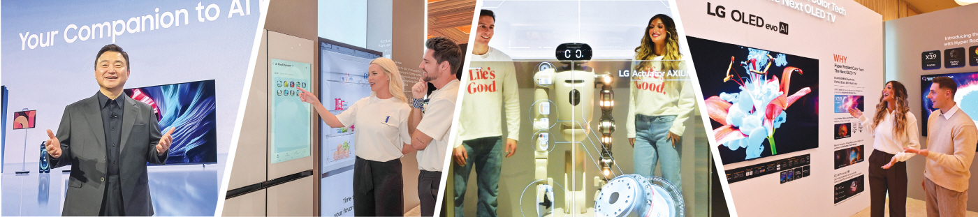 노태문 삼성전자 대표이사 사장(DX부문장)이 '더 퍼스트룩' 프레스 콘퍼런스에서 연설을 하고 있다(왼쪽부터). 삼성전자가 CES 2026 단독 전시관에서 '비스포크 AI 패밀리허브' 냉장고를 소개하고 있다. LG전자가 클로이드와 액추에이터 악시움을 투명 OLED 디스플레이를 통해 소개하고 있다. LG전자가 '더 프리뷰(The Preview)'에서 9mm대 무선 월페이퍼 TV 'LG 올레드 에보 G6'를 공개했다. /제공=삼성전자·LG전자
