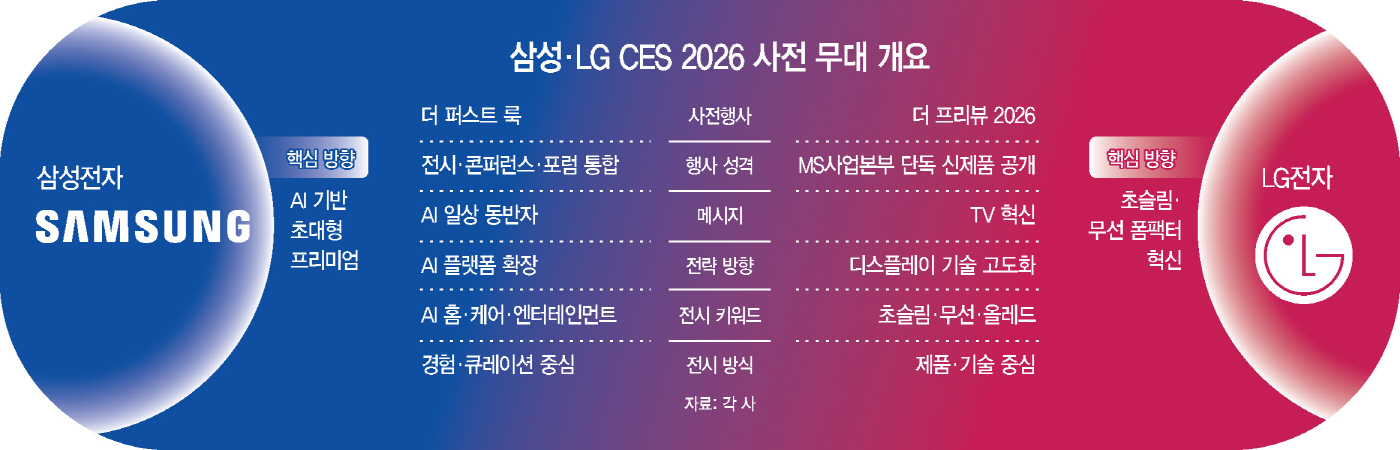 삼성전자와 LG전자가 세계 최대 가전·IT 전시회 'CES 2026' 개막을 앞두고 나란히 사전 행사를 열어 기술 경쟁의 포문을 열었다. 삼성전자는 'AI 일상 동반자'를 전면에 내세워 생활 전반으로 AI를 확장하는 전략을 제시했고 LG전자는 초슬림·무선 올레드 TV를 앞세워 차세대 TV 기술의 방향성을 부각시켰다.