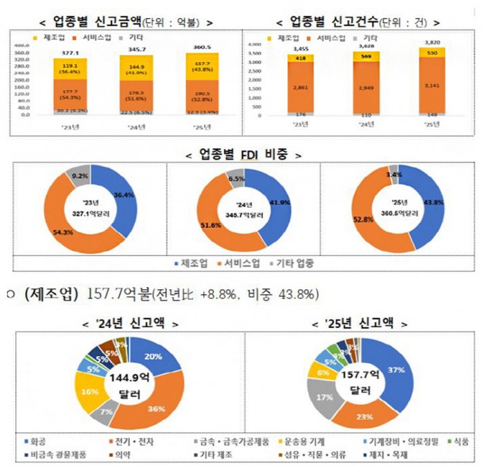 미국발(發) 관세 정책과 보호무역주의 확산 등 글로벌 투자환경 악화 속에서도 지난해 외국인이 우리나라에 신고한 연간 직접투자(외국인직접투자)가 전년 대비 4.3% 증가한 360억 5000만달러로, 역대 최대실적을 기록했다. 자금도착도 전년 대비 16.3% 증가한 179억 5000만달러를 기록하며 역대 3위를 나타냈다.