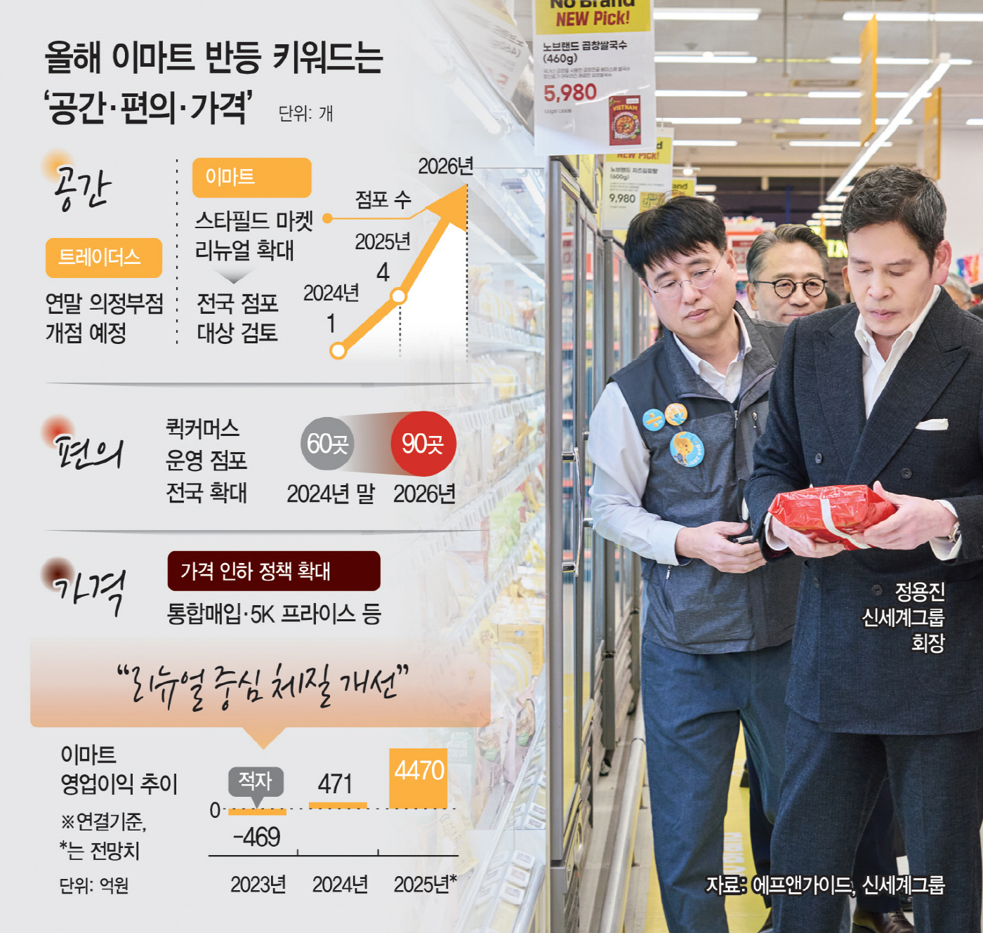 공간 혁신과 함께 쇼핑 편의성 강화도 병행된다. 이마트는 오프라인 점포를 단순 판매 공간이 아닌 배송 거점으로 활용하는 퀵커머스 전략을 확대하고 있다. 퀵커머스 운영 점포는 지난해 60여 곳에서 올해 90여 곳 이상으로 늘릴 계획이다. 가격 경쟁력 강화도 동시에 추진된다. 이마트는 통합 매입과 글로벌 소싱을 기반으로 초저가 자체브랜드(PB) '5K 프라이스'를 내세우고 있다. 통합 매입을 통한 원가 절감과 이를 고객 혜택으로 환원하는 구조가 성과로 이어지고 있다.