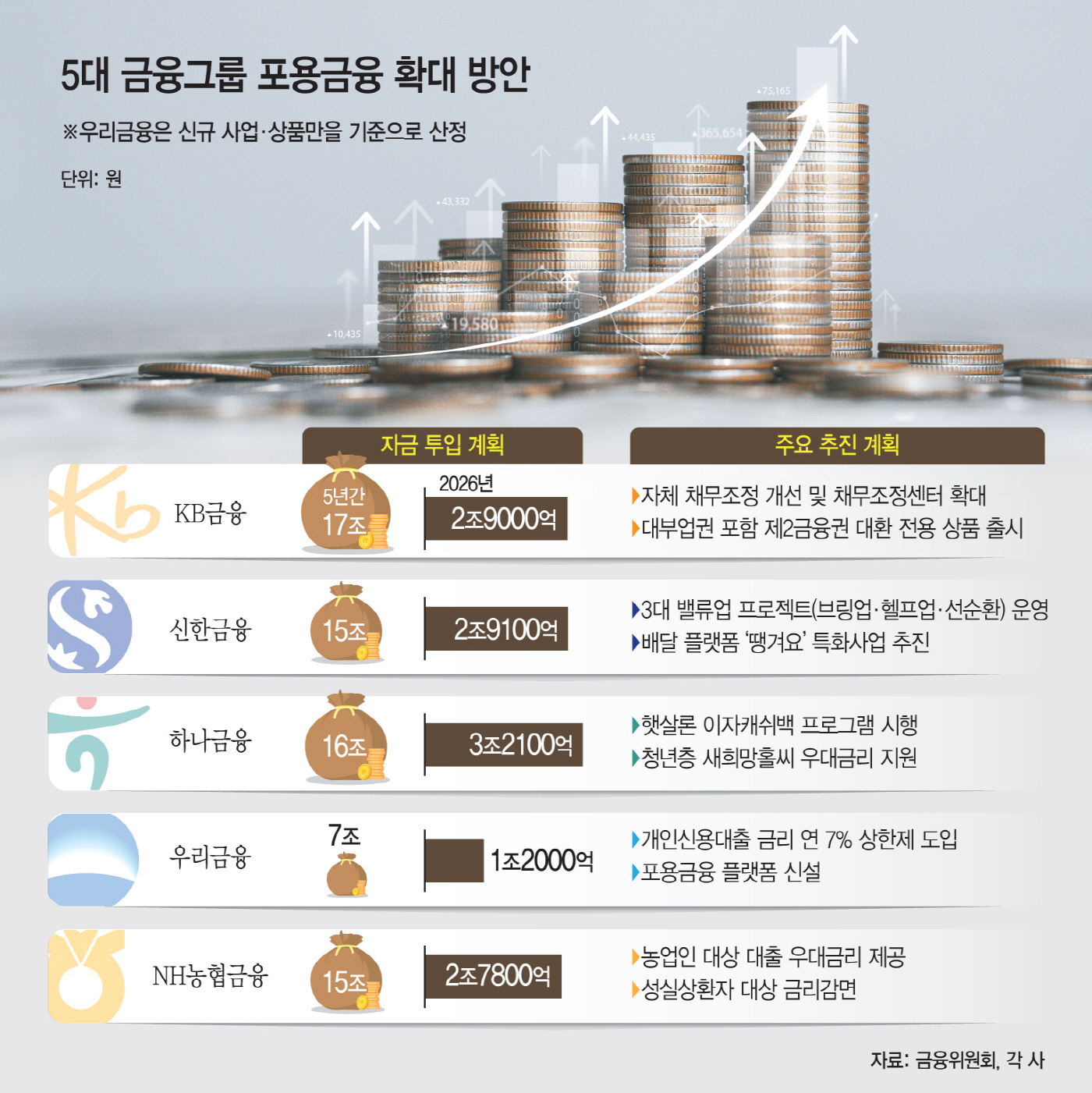 8일 금융권에 따르면 금융위원회는 이날 경기 수원에서 '포용적 금융 대전환 1차 회의'를 열고 KB·신한·하나·우리·NH농협금융이 마련한 포용금융 확대 방안을 발표했다. 이들 금융그룹은 정부의 서민금융 강화 기조에 발맞춰 그룹별로 7조~17조원 규모의 자금 투입 계획을 내놨다. 세부적으로는 올해 12조9987억원을 시작으로, 오는 2030년까지 매년 13조~14조원 규모의 자금이 투입될 예정이다.