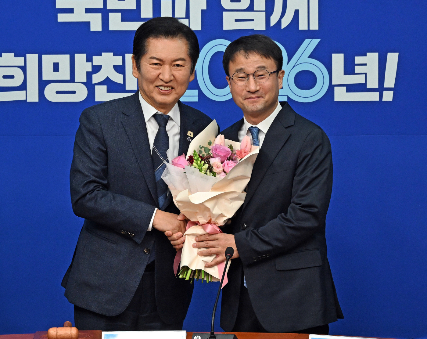 | | 정청래 더불어민주당 대표(왼쪽)가 12일 국회에서 열린 최고위원회의에서 한병도 신임 원내대표에게 꽃다발을 전달하고 있다. /송의주 기자 |