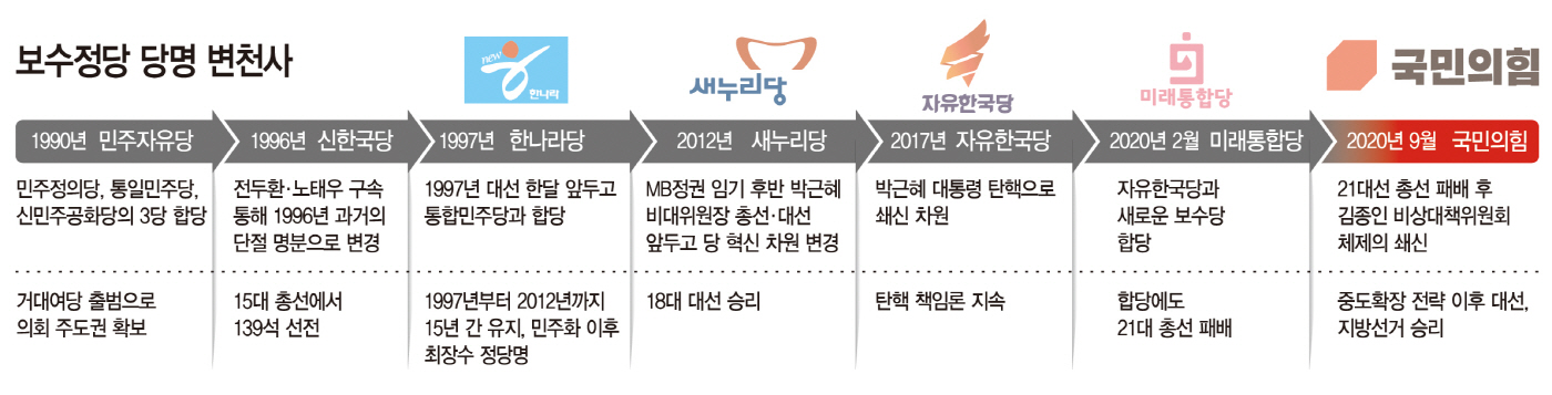 국민의힘의 뿌리는 1990년 민주정의당과 김영삼 전 대통령의 통일민주당, 김종필 전 총재의 신민주공화당의 3당 합당으로 탄생한 민주자유당이다. 민주자유당은 1996년 전두환·노태우 전 대통령이 내란죄 등으로 구속되자 '과거와의 단절'을 명분으로 신한국당으로 당명을 바꿨고 같은 해 15대 총선에서 139석을 확보해 선전했다. 이후 1997년 대선을 앞두고 신한국당은 통합민주당과 합당하며 한나라당으로 개명했다. 한나라당은 1997년부터 2012년까지 15년 동안 유지되며 민주화 이후 '최장수 정당명'으로 기록되며 지금까지도 '보수당의 전성기'라고 평가받는다.
