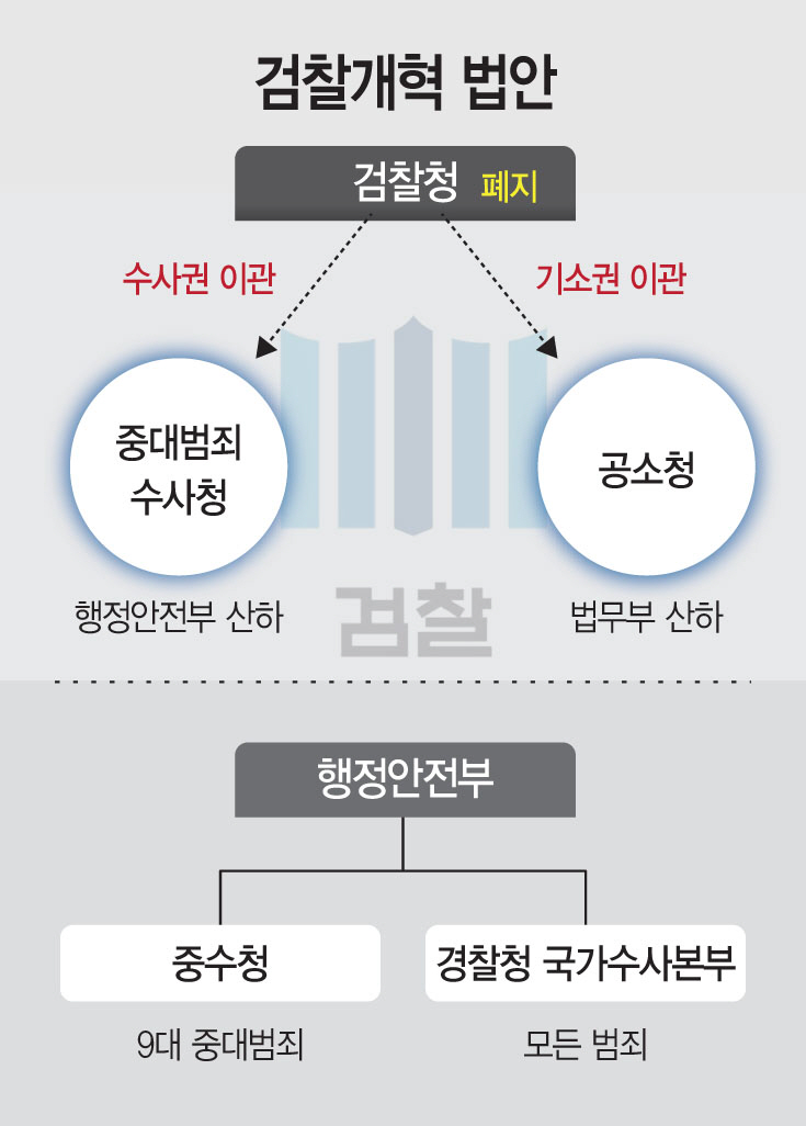 정부는 당초 중수청과 공소청을 각각 행안부와 법무부 산하에 설치해 수사권과 기소권을 분리하고, 검찰에 집중된 권한을 분산시켜 두 기관이 상호 견제하도록 했다. 그러나 행안부가 경찰과 중수청을 산하에 두고 장관까지 예외적으로 중수청의 개별 사건에 대한 지휘·감독 권한을 갖게 되자 권력 남용 우려가 제기되고 있다. 일각에선 기소권을 갖고 있는 법무부가 행안부를 견제할 수 있어야 한다는 지적이 나온다.