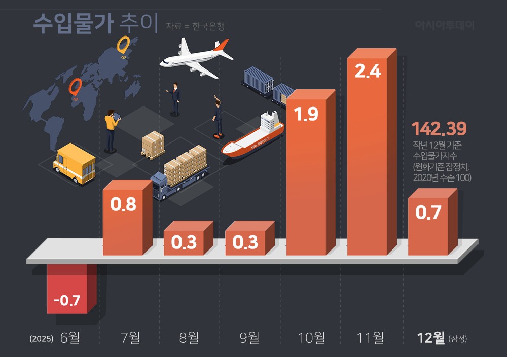 한국은행이 14일 발표한 수출입물가지수 통계에 따르면 작년 12월 기준 수입물가지수(원화기준 잠정치, 2020년 수준 100)는 142.39를 기록해 전월(141.47) 대비 0.7% 상승했다. 수입물가지수가 6개월 연속 오른 건 지난 2021년 5월~10월 이후로 4년 2개월 만이다.