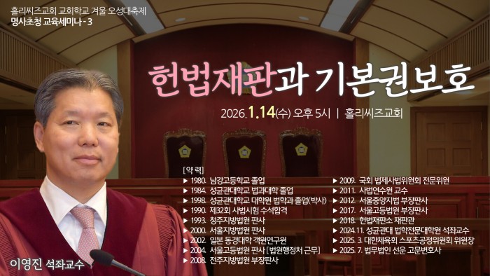 홀리씨즈교회(담임목사 서대천) 교회학교(HSS)는 지난 14일 서울 서초구 방배동의 홀리씨즈교회 비전홀에서 이영진 전 헌법재판관을 초청해 청소년들을 대상으로 ‘헌법재판과 기본권 보호’라는 주제의 특강을 개최했다.