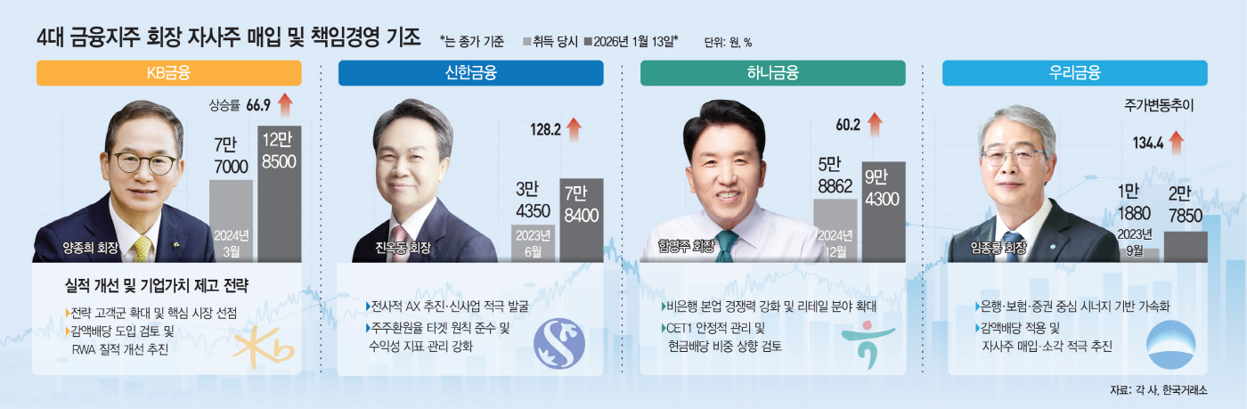 4대 금융 ‘자사주 책임경영’ 통했다… 주가·경영 성과 동반성장