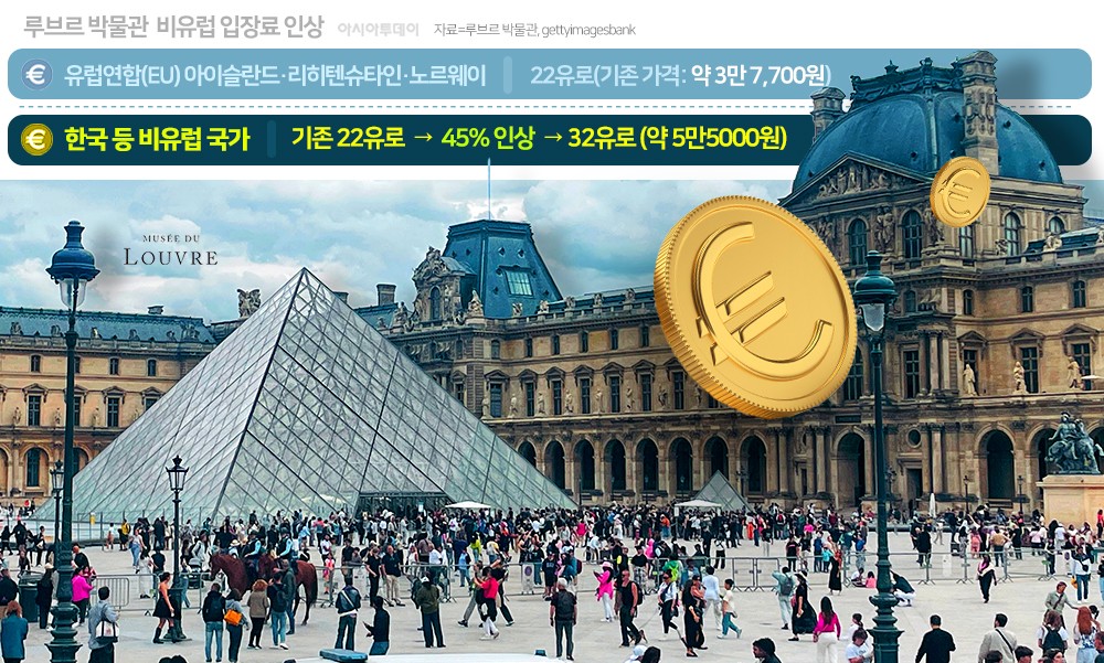 루브르막물관은 14일(현지시간)부터 비유럽인 성인 방문객 입장료를 기존 22유로에서 45%를 인상한 32유로(약 5만5000원)로 책정했다.