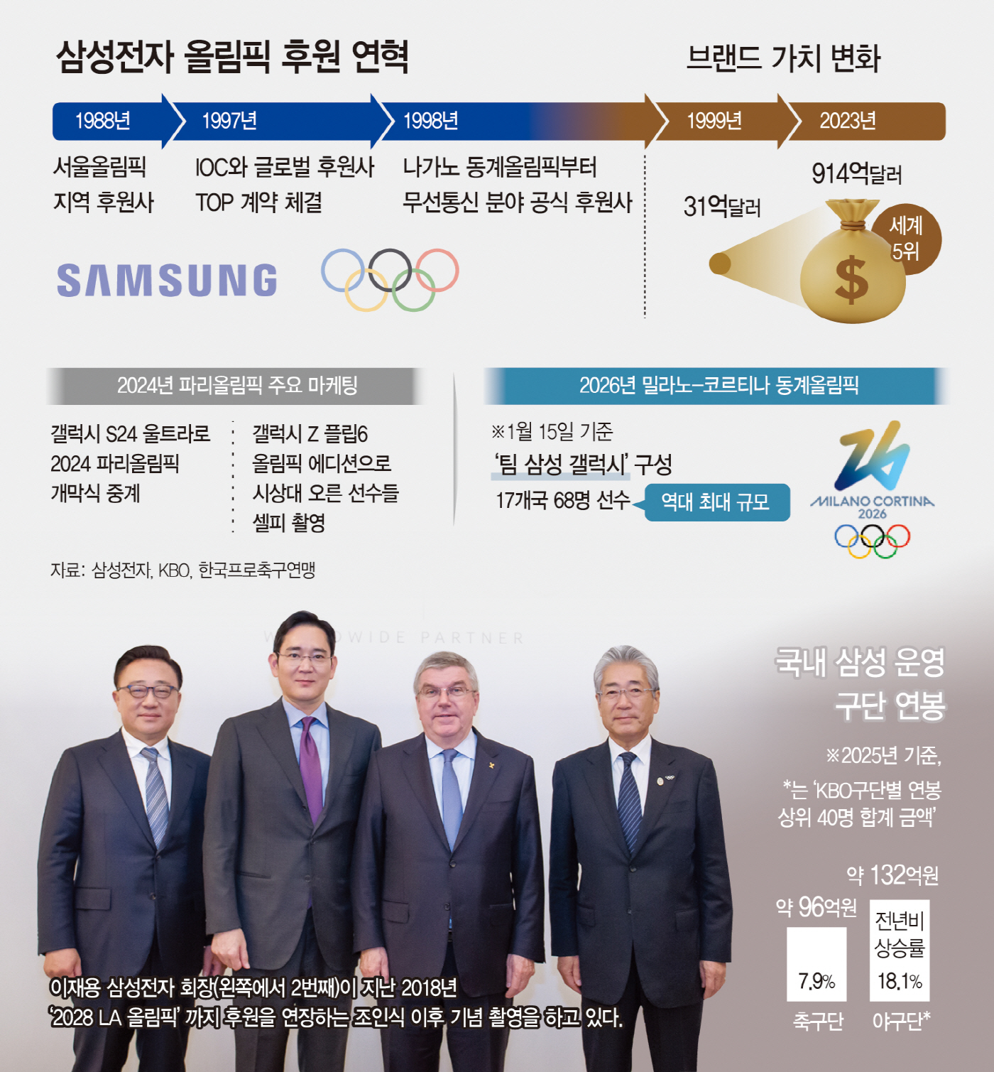 밀라노-코르티나 동계올림픽이 약 3주 앞으로 다가온 가운데 '올림픽 기업'으로 통하는 삼성전자가 이번에도 대대적 브랜드 마케팅전을 예고했다. 삼성은 그간 올림픽을 통해 브랜드가치를 30배 이상 끌어올린 것으로 평가하고 있다. 올림픽에 그치지 않고 운영 중인 축구와 야구 등 국내 주요 스포츠단 성적에 대한 기대도 커진다.