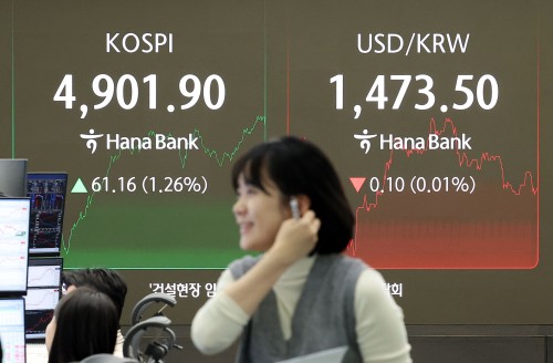 이날 오후 1시 59분 현재 코스피는 전장보다 64.72포인트(1.34%) 오른 4,905.46이다.