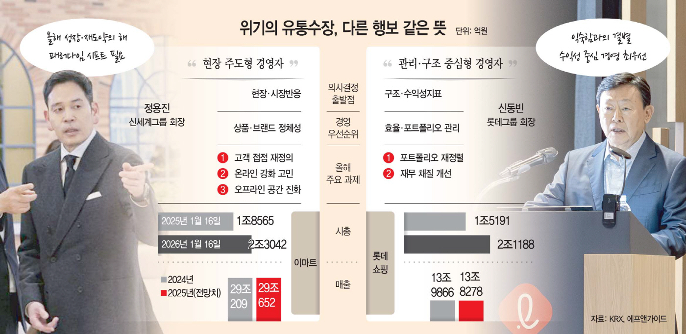 유통업계를 이끄는 두 수장, 정용진 신세계그룹 회장과 신동빈 롯데그룹 회장이 연초부터 상반된 리더십 행보를 보이고 있다. 정 회장이 현장을 누비며 오프라인 경쟁력 재정의에 나서는 반면, 신 회장은 조직과 사업 구조를 먼저 손보며 수익성과 효율 중심의 체질 개선에 집중하고 있다. 접근 방식은 다르지만, 기존 유통 모델로는 더 이상 버티기 어렵다는 위기 인식만큼은 공통적이다.