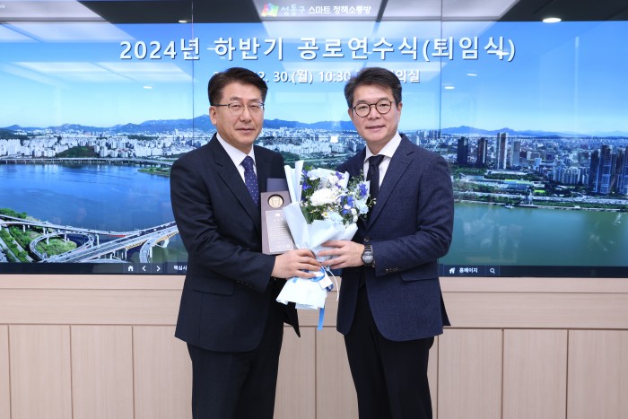 | 유보화 전 성동구 부구청장(왼쪽)이 2024년 12월 30일 성동구청에서 퇴임식을 가졌다. 정원오 성동구청장의 12년 구정 가운데 4년을 부구청장으로 함께하며 구정을 이끌었다. / 사진=유보화 전 성동구부구청장 |