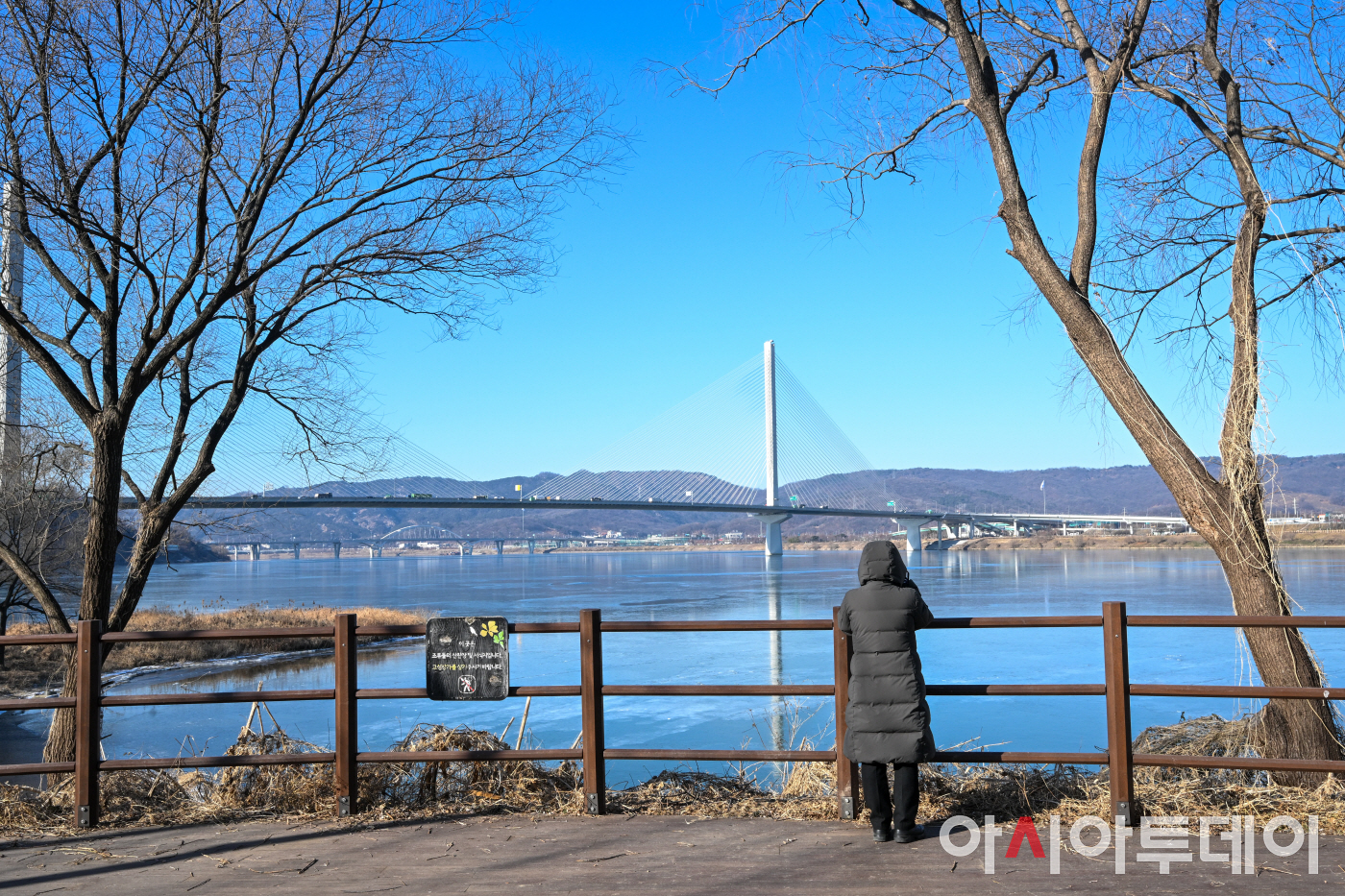 21일 서울 강동구 고덕천교 일대에 조성된 한강 그린웨이 '고덕천 라운지'를 찾은 시민들이 조망 데크에서 한강을 바라보고 있다. 강동구는 올림픽대로 고덕천교 하부의 유휴공간을 한강까지 이어지는 체류형 수변 문화공간 ‘고덕천 라운지’로 조성했다. 특히 한강이 조망되는 데크 구간도 함께 정비해 벤치와 쉼터 기능을 강화했다. /정재훈 기자
