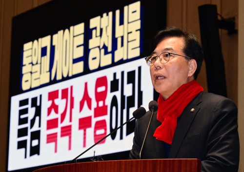 | 송언석 국민의힘 원내대표가 21일 국회에서 열린 긴급 의원총회에서 발언을 하고 있다. /이병화 기자 |
