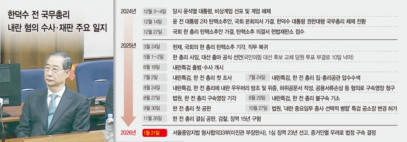 12·3 비상계엄이 '내란'으로 인정되면서 '국정 2인자'였던 한덕수 전 국무총리가 징역 23년을 선고받고 법정구속됐다. 전직 국무총리가 내란 관련 혐의로 유죄를 선고받은 것도, 법정구속된 것도 헌정사상 처음이다. 재판부는 선고 초반부터 '친위 쿠데타' '독재자' '추종 세력' 등 강도 높은 비판을 쏟아냈다. 이를 두고 향후 내란 재판에서 법원이 취할 기준과 태도의 윤곽이 드러났다는 평가가 나온다. 특히 재판부가 이번 계엄을 '위로부터의 내란'이라고 표현한 것은 '더 높은 권력자에게 더 무거운 형량'이라는 강력한 메시지를 던진 것으로 보인다.