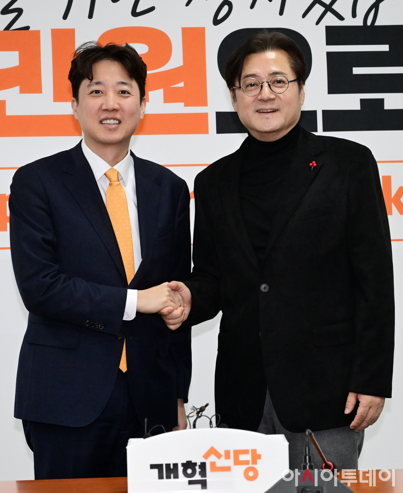 이준석 개혁신당 대표가 23일 국회를 찾은 홍익표 청와대 신임 정무수석과 악수를 나누고 있다.