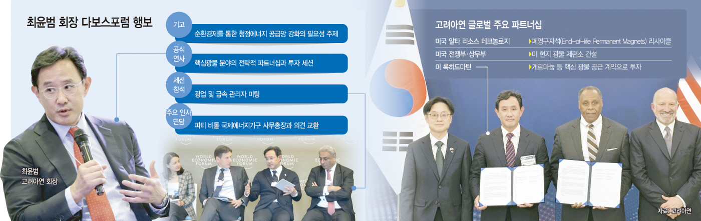 25일 고려아연에 따르면 최 회장은 지난 19일부터 23일까지 스위스 다보스에서 열린 다보스포럼에서 핵심 광물 공급 핵심사업자로서 기조 연설을 하고, 포럼 산하 광업·금속 운영위원회 위원 4인 중 하나로서 글로벌 기업인 및 정부 인사들과 협력하는 등 맹활약했다.