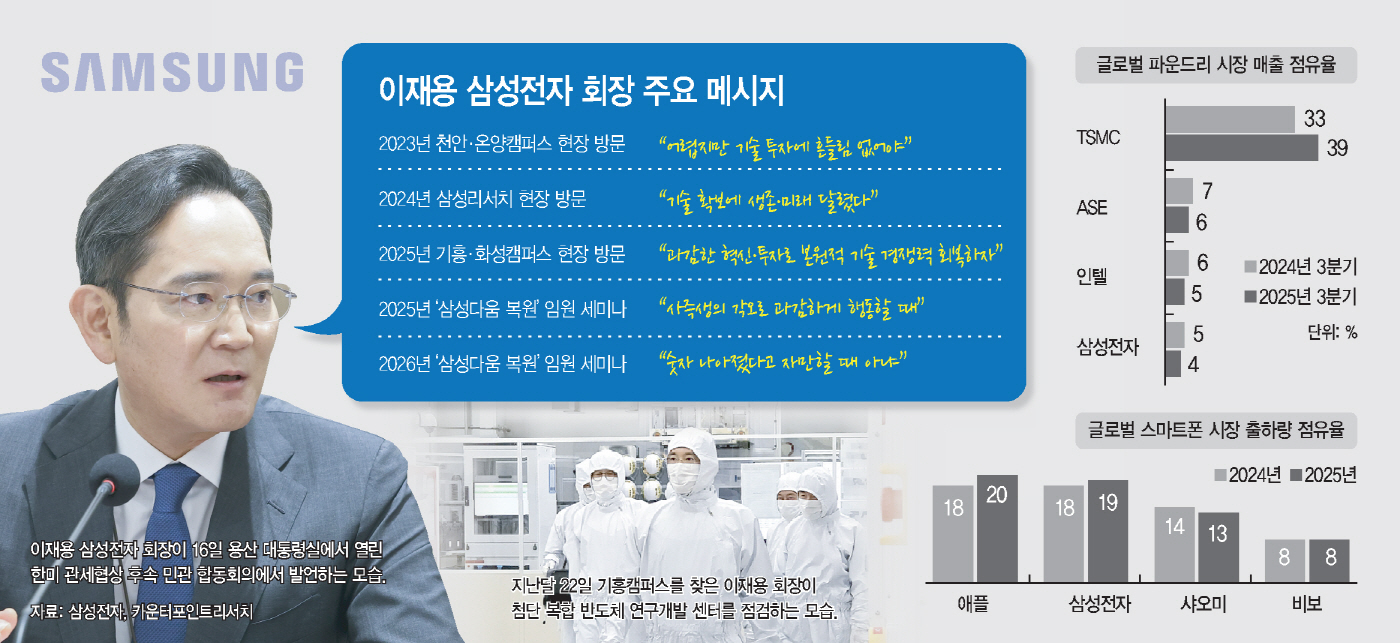 지난해 연간 영업이익은 43조원을 넘었고, 주가도 15만원선을 돌파한 상태다. 다만 일부 반도체 사업과 TV·스마트폰 등 세트 사업의 성장세가 둔화한 만큼 내부의 들뜬 분위기를 다잡고, 기술 경쟁력의 중요성을 다시 한 번 짚은 것으로 읽힌다.