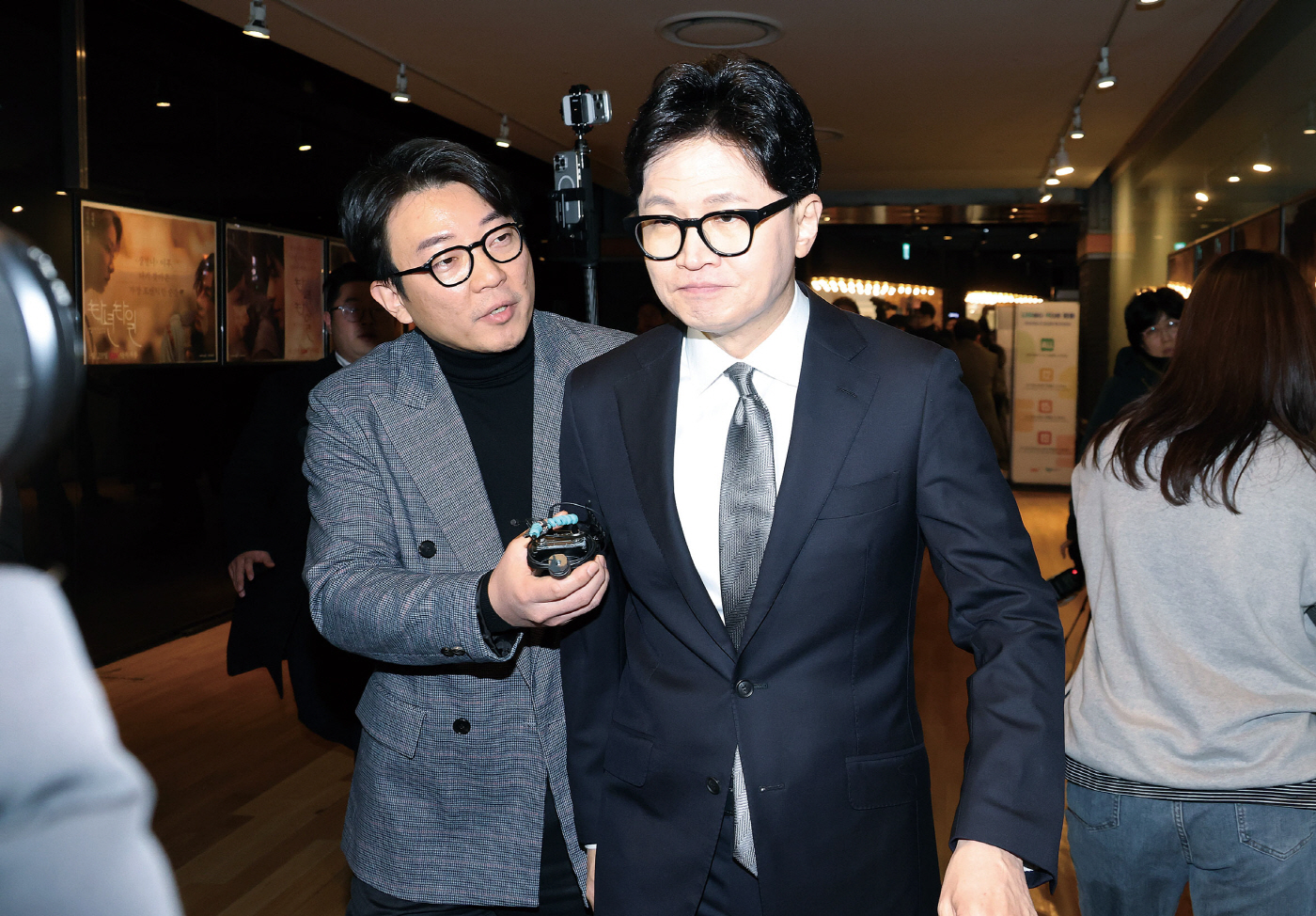 한동훈 전 국민의힘 대표(오른쪽)가 28일 서울의 한 영화관에서 '잊혀진 대통령: 김영삼의 개혁 시대'를 관람하기 위해 이동 중 취재진의 질문에 답하지 않은 채 지나가고 있다. /연합