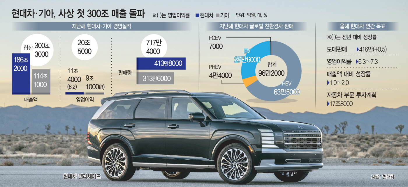 전날 실적을 발표한 기아의 매출액을 합산하면 현대차·기아의 연간 매출은 300조원을 넘어선다. 현대차와 기아가 합산 기준으로 연 매출 300조원을 달성한 것은 이번이 처음이다.