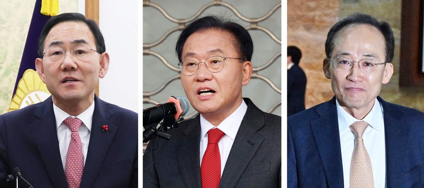 6·3 지방선거 대구시장 출마를 선언한 주호영 국회부의장(왼쪽부터), 윤재옥 국민의힘 의원, 추경호 국민의힘 의원. /송의주 기자·연합