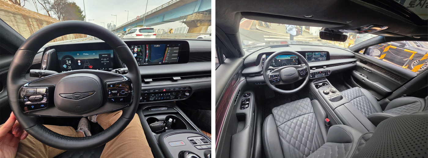 제네시스 G90 블랙 롱휠베이스 운전석에서 주행 중인 모습(왼쪽)과 1열 실내 모습. /김정규 기자