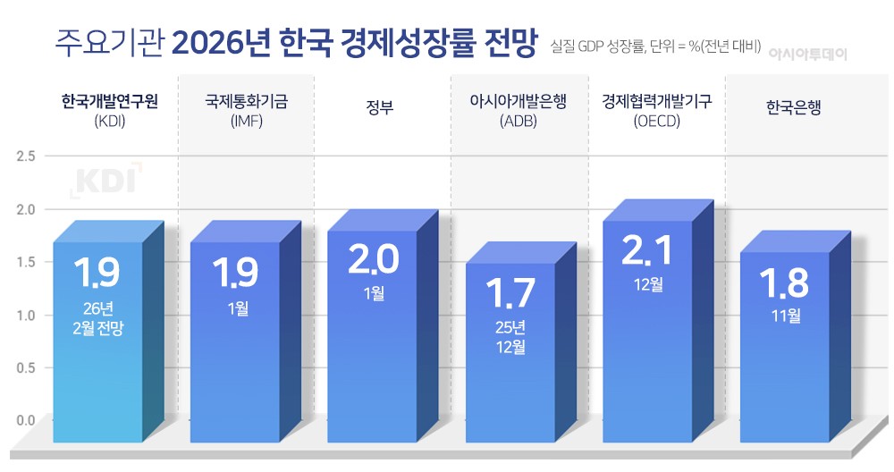 KDI는 11일 발표한 '2026년 2월 경제전망 수정'을 통해 올해 한국 경제 성장률 전망치를 지난해 11월 발표한 1.8%보다 0.1% 포인트(p) 상향했다. 이번 전망치는 정부(2.0%) 전망치 보다는 낮지만 한국은행(1.8%) 전망치 보다는 높은 수준이다.