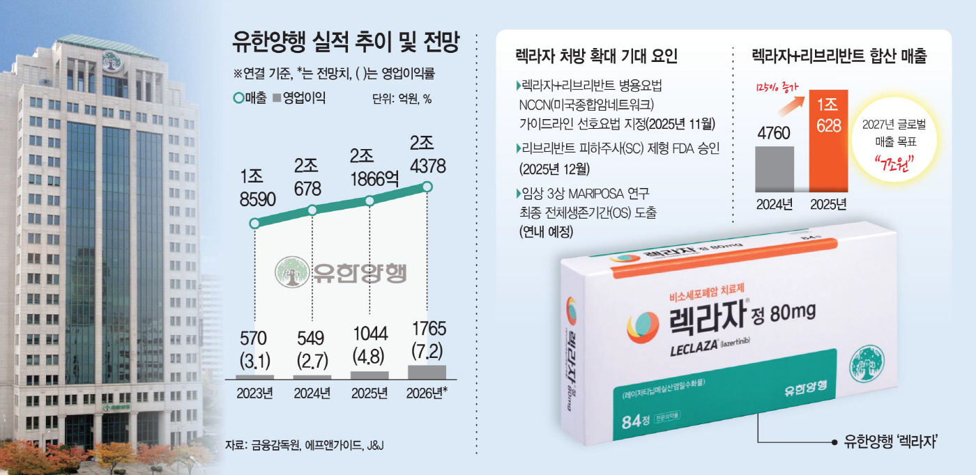 J&J의 최근 실적 발표에 따르면 렉라자+리브리반트 병용요법의 지난해 매출은 7억 3400만 달러(약 1조682억원)로 전년 대비 125% 증가했다. J&J는 해당 병용요법의 2027년 글로벌 매출 목표를 최소 50억 달러(약 7조원)로 제시하고 있다. 유한양행은 계약 조건에 따라 렉라자 순매출의 10% 이상을 로열티로 수령하고 있어 향후 처방 확대 속도에 따라 실적 상승 폭도 좌우될 전망이다.