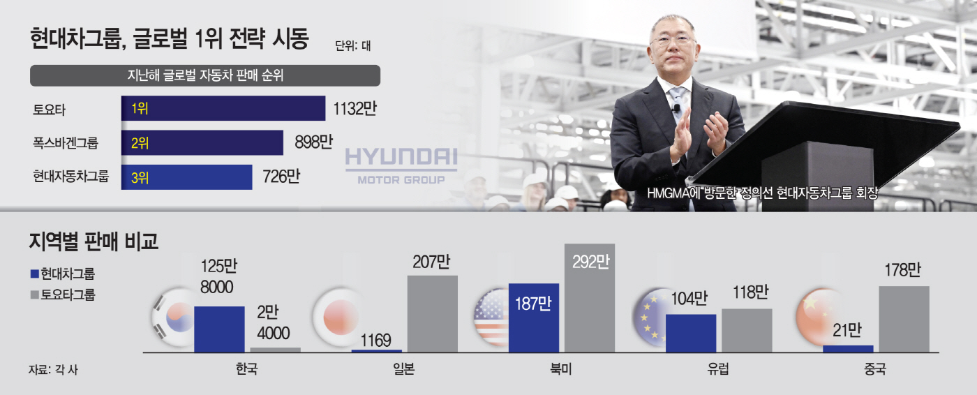 11일 현대차그룹에 따르면 지난해 글로벌 판매는 726만대로 토요타그룹(1132만대), 폭스바겐그룹(898만대)에 이어 3위를 기록했다. 글로벌 1위 토요타그룹과의 판매 격차는 400만대 이상이다. 단기간에 따라잡기 쉽지 않은 수치지만, 지역별로 들여다보면 격차가 집중된 시장은 비교적 명확하다.