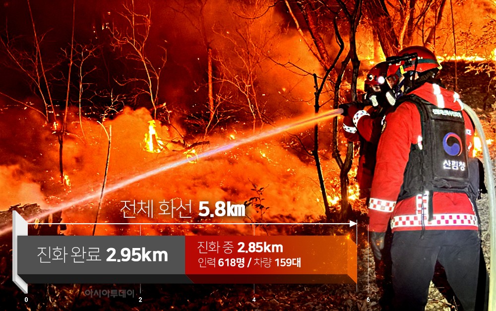 산불 영향 구역은 124㏊로 확대됐다. 이번 산불은 건조한 날씨와 강풍 속에서 발생했으며, 일몰을 앞둔 시간에 시작돼 헬기 진화에 공백이 생기면서 밤사이 확산을 막는 데 어려움을 겪었다.