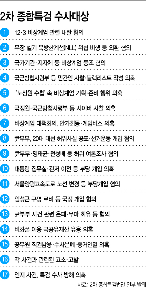 수사 대상은 3대 특검에서 규명되지 않은 의혹 17가지다. 내란특검 7개, 김건희특검 6개, 순직해병특검 1개 등이다. 구체적으로 살펴보면 '노상원 수첩'에 적힌 국회 해산 의혹, 무인기로 북한 도발을 유도한 외환 의혹, 김건희 여사의 국정 개입 의혹, 서울양평고속도로 종점 변경 의혹, 임성근 구명 로비 의혹 등이다.